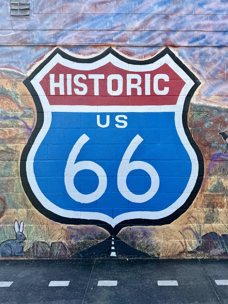Seguendo questo percorso si arriva verso l’ora del tramonto, con le luci della città che si accendono, creando un’atmosfera perfetta per concludere il viaggio attraverso la Route 66. Resta poco tempo per le visite, ma vale comunque la pena fermarsi e scattare qualche foto ai pannelli giganteschi che celebrano la storia della strada.