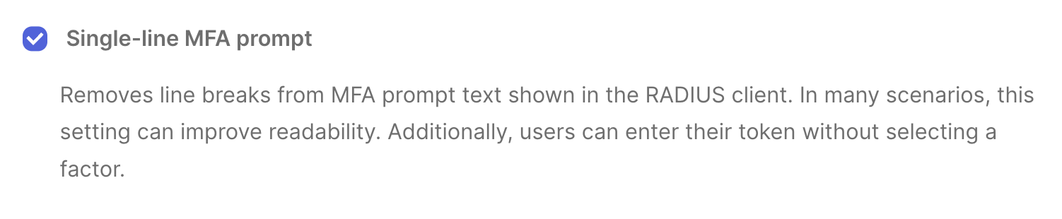 - Factor Enrollment: Okta recommends that users enroll no more than eight MFA factors at a time. If too many factors are enrolled, the challenge message displayed in the RADIUS prompt can become too large, leading to a poor user experience.