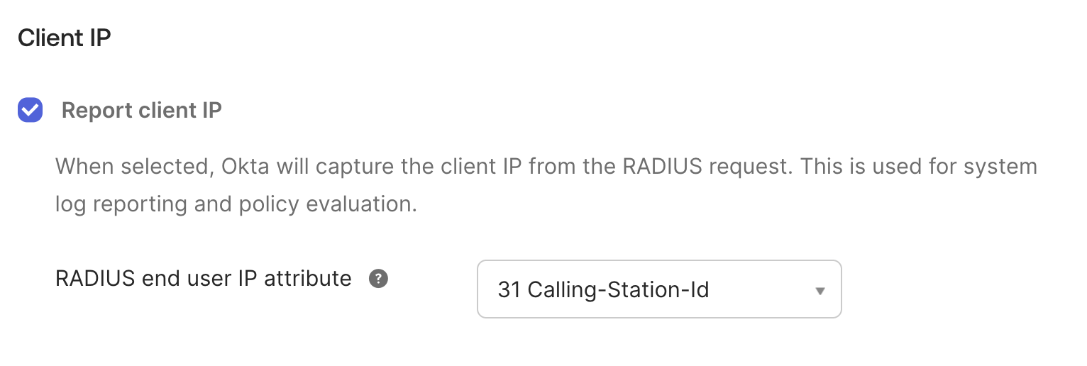 To solve this, many RADIUS-enabled devices can send the end-user’s IP address within a specific RADIUS attribute. The Okta RADIUS Server Agent is designed to look for the client IP in the following standard RADIUS attributes, such as: Calling-Station-Id
